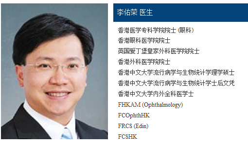 李佑荣医生是香港眼科学会会长(2013-2015),他是视网膜和黄斑点手术的医生。他于1993年毕业于香港中文大学医学院,早于担任实习医生时便已师承林顺潮医生。毕业后在香港眼科医院完成眼科专科培训,并于2002年获颁李宝椿海外研究生奖学金,于南加州大学Doheny 眼科中心跟随强大Eugene de Guan 教授深造视网膜和黄斑点的复杂手术。他于2009年获颁授流行病学与生物统计学理学硕士学位。