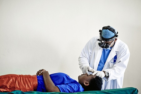 (尼思特医生正在用眼底镜为卢旺达城市的病人提供免费眼科检查,检查是否患有糖尿病性黄斑疾病)