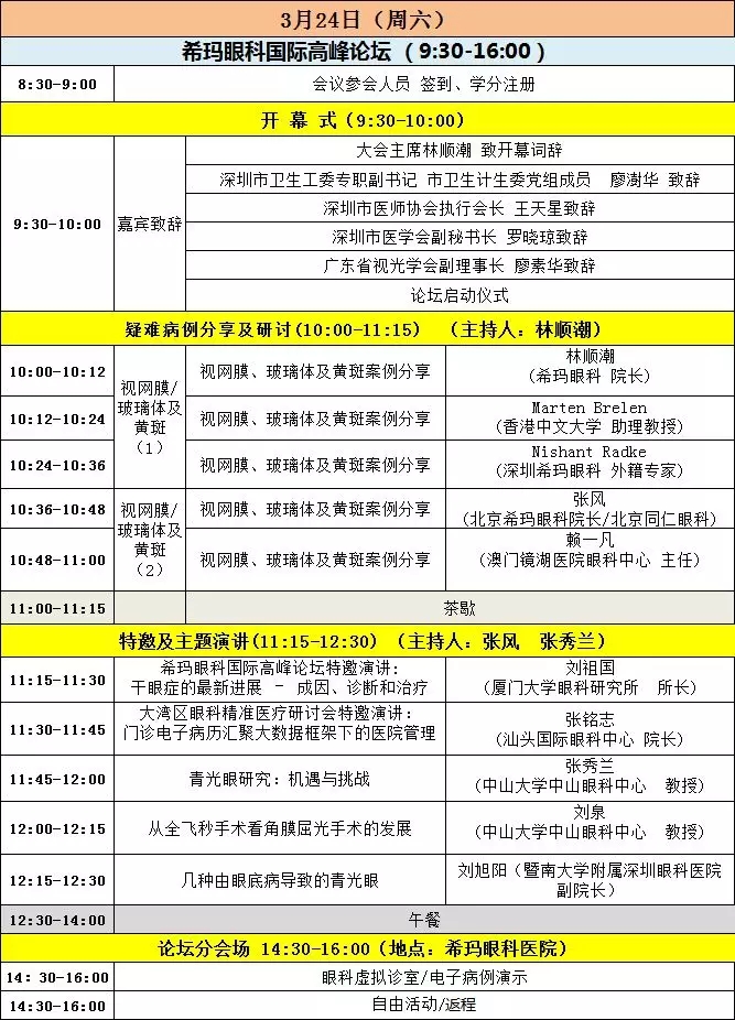 明天!由深圳市医师协会、深圳市医学会、深圳希玛林顺潮眼科医院主办的“首届希玛眼科国际高峰论坛暨大湾区眼科精准医疗研讨会”将在深圳蓝楹湾度假酒店盛大召开!诚挚邀请各位眼科同仁拨冗亲临本届会议,共襄眼科会议之盛举。